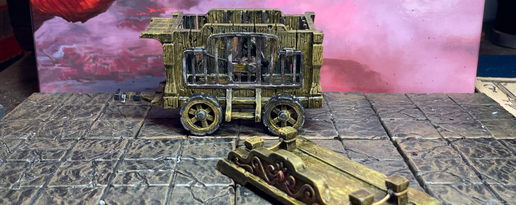 DM Ben happily colored up this absolutely charming wagon and is super pleased with the results. The roof is removable, and it holds a standard d20 miniature or two behind those thick metal bars with ease. Now, longtime DnD readers of our quaint lil’ ol’ blog know that we’re always trying new wood color variations because it’s such a dominant theme in our miniatures and scatter terrain.