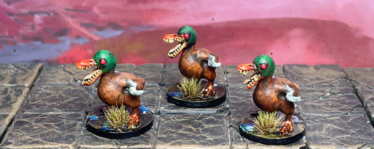 DM Ben pictures these nasty ankle biters as more of a pack unit, so he’ll probably do five to ten of them in total. These went pretty quickly once he finally stopped overthinking the wing colors. For their stats, we have a lot of geese and ducks in our office complex parking lot, and they’re mean SOBs. Hence, he wanted to translate our disgust for them in the game. 😉