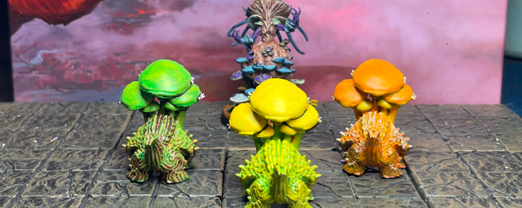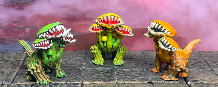 We 3D-printed a small group of these un-fungi and shipped them off to Kimmy Utah to paint. She knows that whenever we send her duplicates of a miniature, she should paint them a little differently so we can better identify them at a glance as monster 1, monster 2, etc. Boy howdy, did she absolutely crush these guys! We’ve had these front and center in a display case for some time now. We just love ’em!