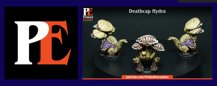 Now, the group could talk their way through the encounter with a series of persuasion and charisma checks, but if things take a nasty turn, Hymeno will suddenly rip off several smaller mushrooms from his body and create some fierce soldiers for his side! And the minis that are going to be used for those menacing monsters are these Deathcap Hydras by Printed Encounter! These nasty chompers are a free download, and the sculpt is wicked good!
