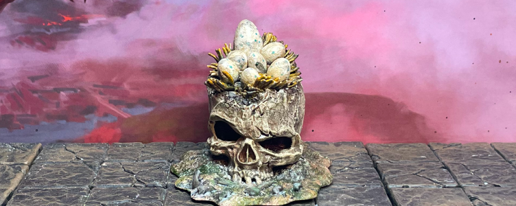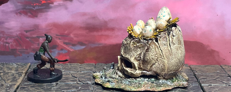 Technically, this RPG 3D print breaks DM Ben’s “No eyes, no problem” rule of them, but hey, they’re really big eyes, right?! He’s also gotten comfortable with a particular bone paint scheme, thanks to YouTuber Apathetic Fish Miniatures. That same confidence goes for the hay and straw, critical to the nest. We’ve even done several eggs before, too!