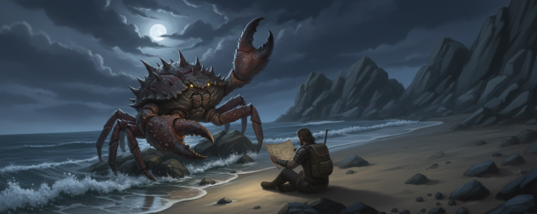 For the monster stats, we’re going to use the Giant Crab 5e stats: AC 15, HP 13, +3 att/1d6+1 bludgeoning damage, grapple DC 11. For the momma, we’ll go with the Huge Crab 5e stats: AC 15, HP 161, +9 att/4d10+5 bludgeoning damage, grapple DC 14.