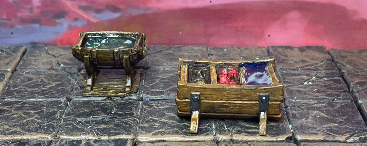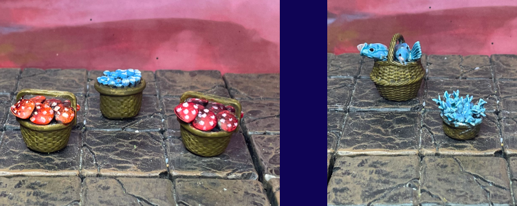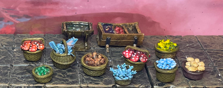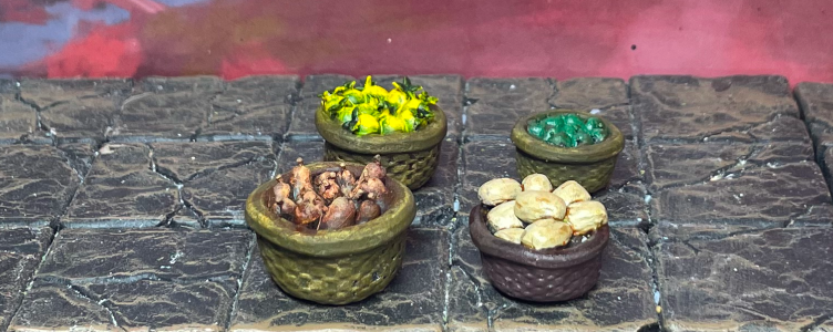The key takeaway core paint color here is the basket color, though! We hadn’t really found a paint pot we liked until we tried GSW Elfwood Brown. The key is to put on two coats, and then you can do a wash over that depending on how dark you want them. Several of these featured baskets are from STL Miniatures’ awesome Food Vendors Set.