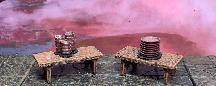 Never discount these subtle clues when building your rooms. Super simple to paint here, too. Just pick a copper tone and little drybrush a little black over the top so they look a bit weathered. These plates and bowl stacks are from EC3D Designs’ Hero’s Hoard series, specifically the Inn and Tavern Set 2.