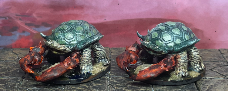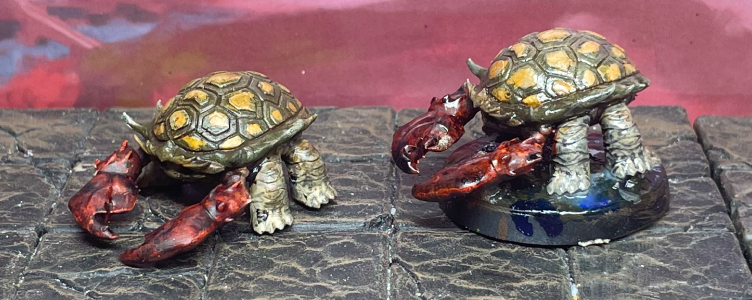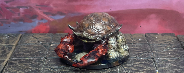 Since we already had a great plan for the crab claws, the wet-sand base, and the turtle legs (thanks to some previously painted models and videos), the goal was to develop a slick shell.