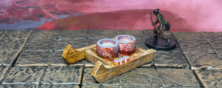 Let’s start with this fun Egyptian-style sled. Throughout this series, we’ve conducted extensive historical research for color inspiration and to gain a deeper understanding of how things might have worked in the past. It turns out Egyptian builders did indeed use mortar in their builds, so we pictured these two messy pots being filled with that mixture. We might circle back, add a little flock to one pot, and make the other a muddy mixture.