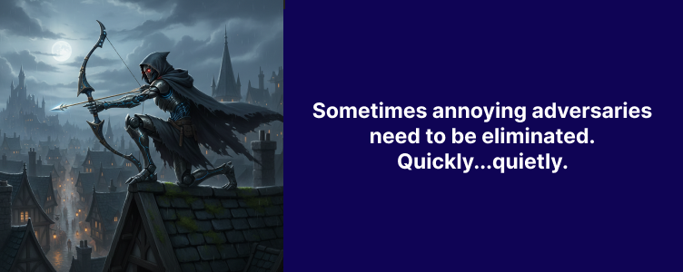 The soldiers are modeled after a Warforged Scout Ranger (CR 2-3). This assassin squad utilizes a 30 speed, and all arrows are poison (DC 15 Con or take 7d6 poison damage/save for half). Range is 100/400 ft. Can take a -5 penalty to the roll for +10 more damage. Stealth is +11. Sharpshooters ignore cover.