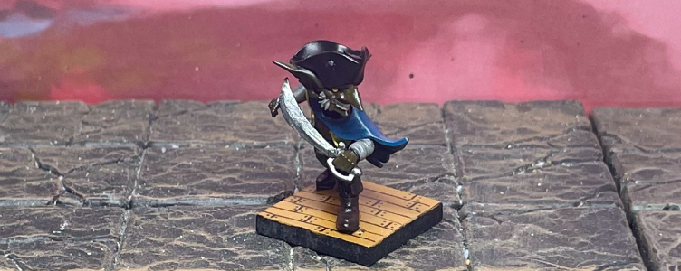 The Lord of the Rings movies (and even the Prime Series) mean Goblins will always be a fav amongst the 3DRPG crew. Hence, this is one of our favorites. Resident painter Kimmy Utah was our chief colorist here, and we love her palette selection: perfect dark green skin and a flowing blue cap, all resting on a custom pirate plank surface. Don’t mess with this little guy unless you want a blade up your nose.